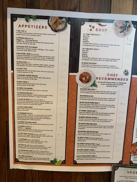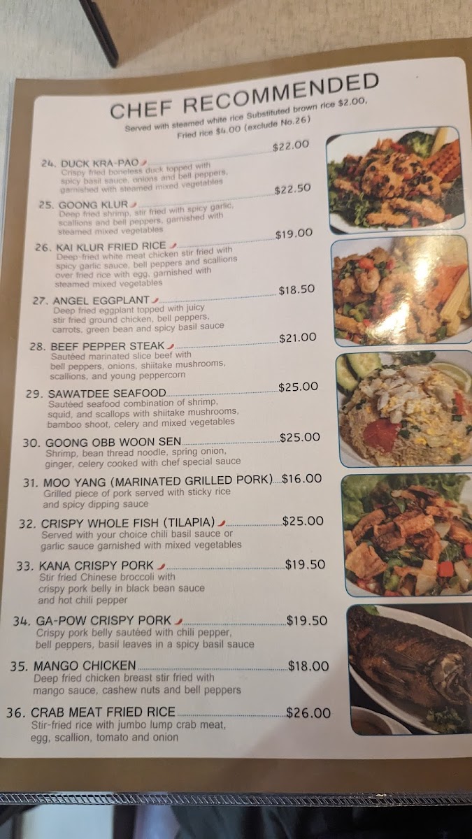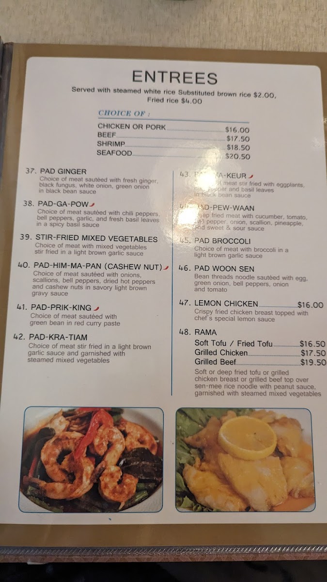 The highlight of the menu includes the Sawatdee Seafood, a succulent combination of shrimp, squid, and scallops, while the Duck Kra-Pao stands out for its crispy fried duck topped with a robust basil sauce. For noodle enthusiasts, the Goong Obb Woon Sen offers a flavorful blend of shrimp and bean thread noodles, beautifully crafted with a chef's special sauce. Additionally, the Moo Yang presents marinated grilled pork paired with sticky rice—truly a crowd pleaser.